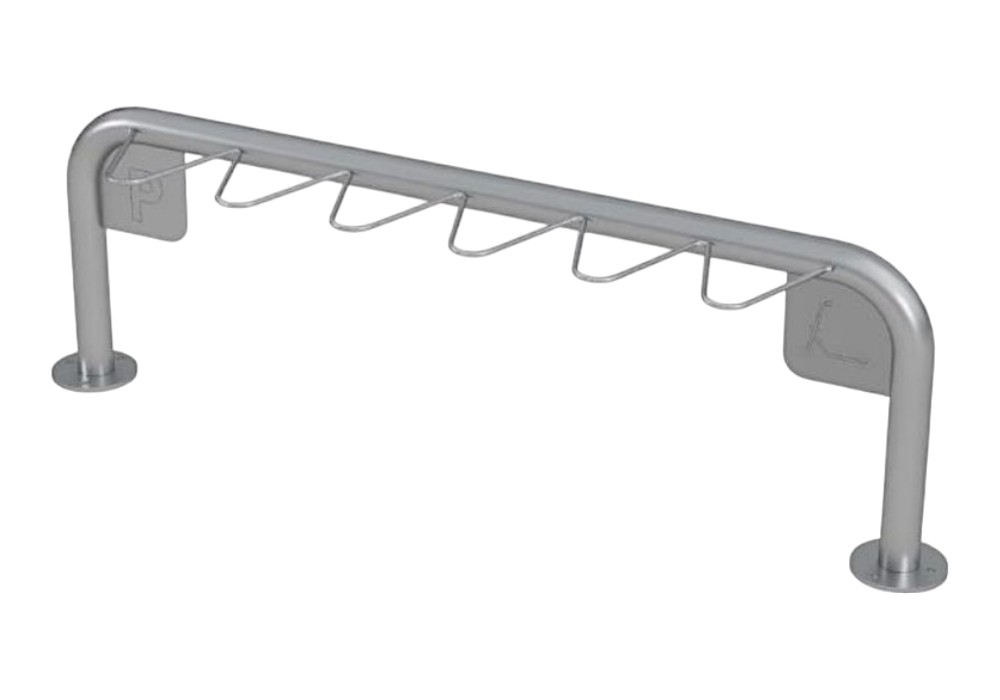 Aparcapatinetes DUMUAP-04 para 5 patinetes, fabricado en acero galvanizado y diseñado para ofrecer una solución segura, funcional y duradera en el estacionamiento de patinetes eléctricos y manuales en exteriores.