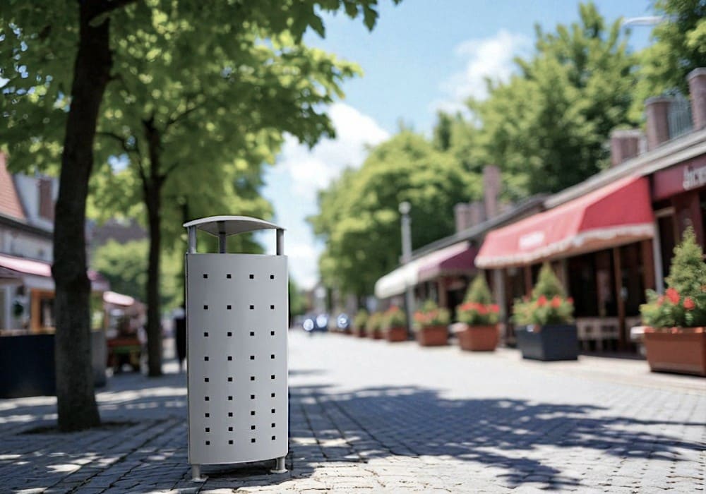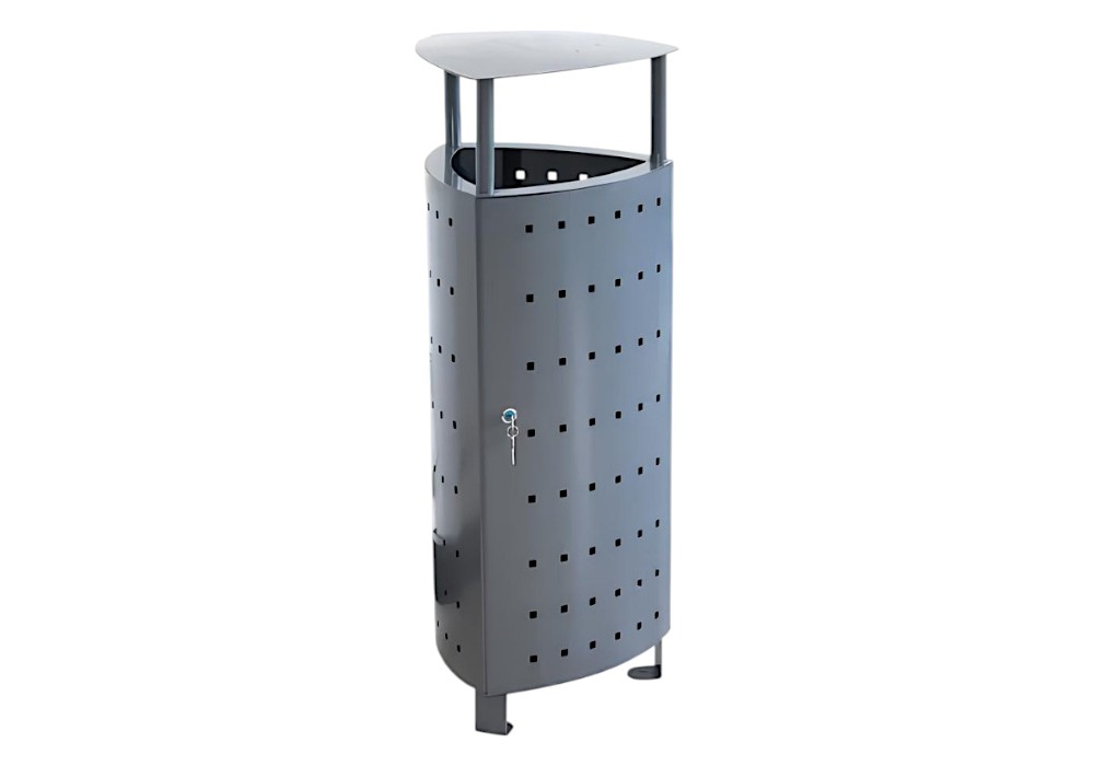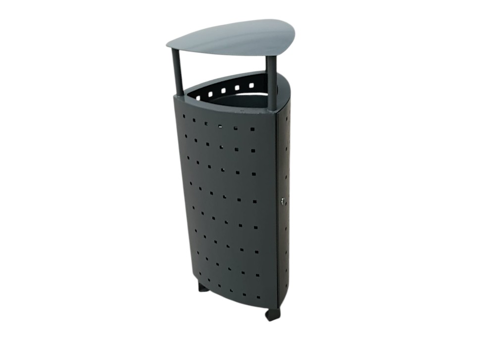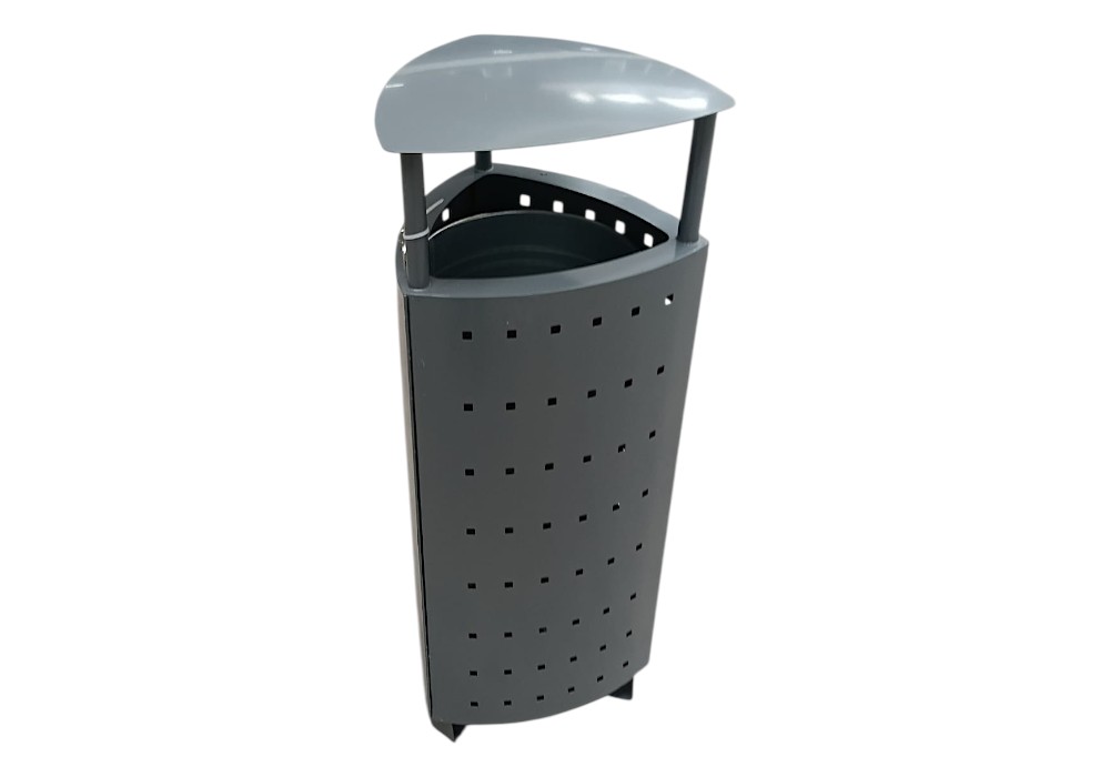 Su diseño triangular con chapa perforada aporta una imagen contemporánea, elegante y funcional, facilitando su integración en entornos urbanos actuales. Gracias a su capacidad de 58 litros, esta papelera exterior resulta ideal para zonas con gran afluencia de personas.